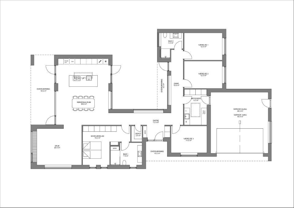 Til højre for entréen ligger en værelsesgang med tre gode værelser, et badeværelse og et funktionelt bryggers med adgang til garagen. Til venstre ligger et depotrum samt et soveværelse med eget badeværelse. For enden af gangen åbner det store køkken/alrum sig, hvor store vinduespartier på tværs af rummet sikrer et fantastisk lysindfald. Køkkenet er det ideelle samtalekøkken med rigelig bordplads, og stuen, der er delvist åbent mod køkken/alrummet, har brede vinduer med indbygget siddebænk, der indbyder til afslapning.
