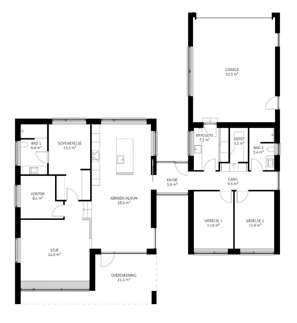 Udover den viste løsning, er der selvfølgelig rig mulighed for individuelle tilpasninger. Det viste hus er tegnet med udgangspunkt i byggegrunden, verdenshjørner og de typiske ønsker til rum og rumstørrelser.