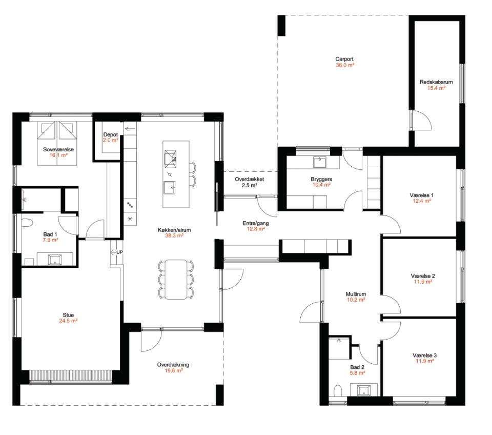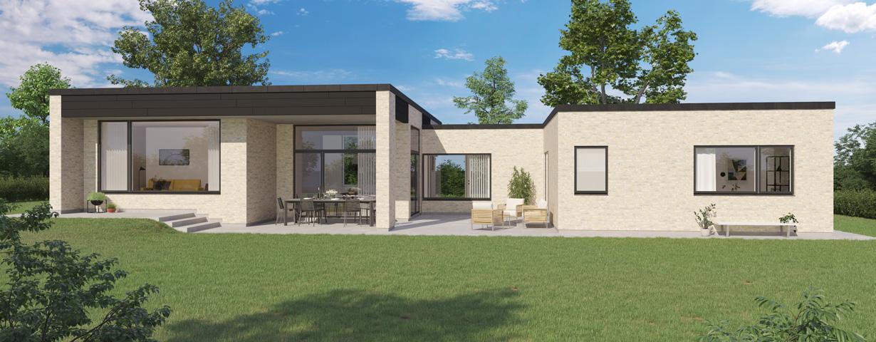 I år viser vi en 205 kvm. funkisvilla med dobbelt carport. Planløsningen tager udgangspunkt i vores klassiker T-HUSET®. Kernen i huset er den unikke og åbne køkken/alrum/stue-løsning med det fantastiske lysindfald og niveauforskydning op i stuen.