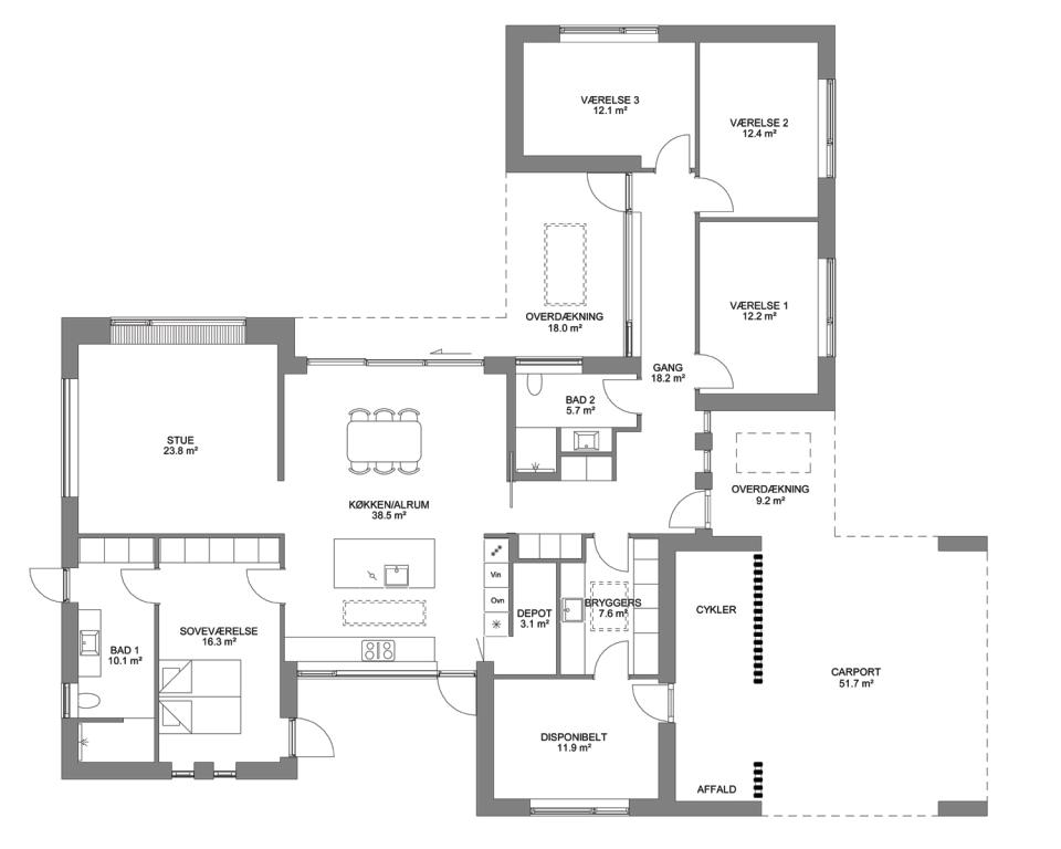 Funkishuset på 213 kvm er stort, men en del af årsagen er, at vi har tænkt ind i fremtidige brugs- og udvidelsesmuligheder. I stedet for det sædvanlige isolerede redskabsrum har vi for en beskeden merpris lagt dette ind under husets klimaskærm, hvorved rummet kan benyttes til mange flere formål.