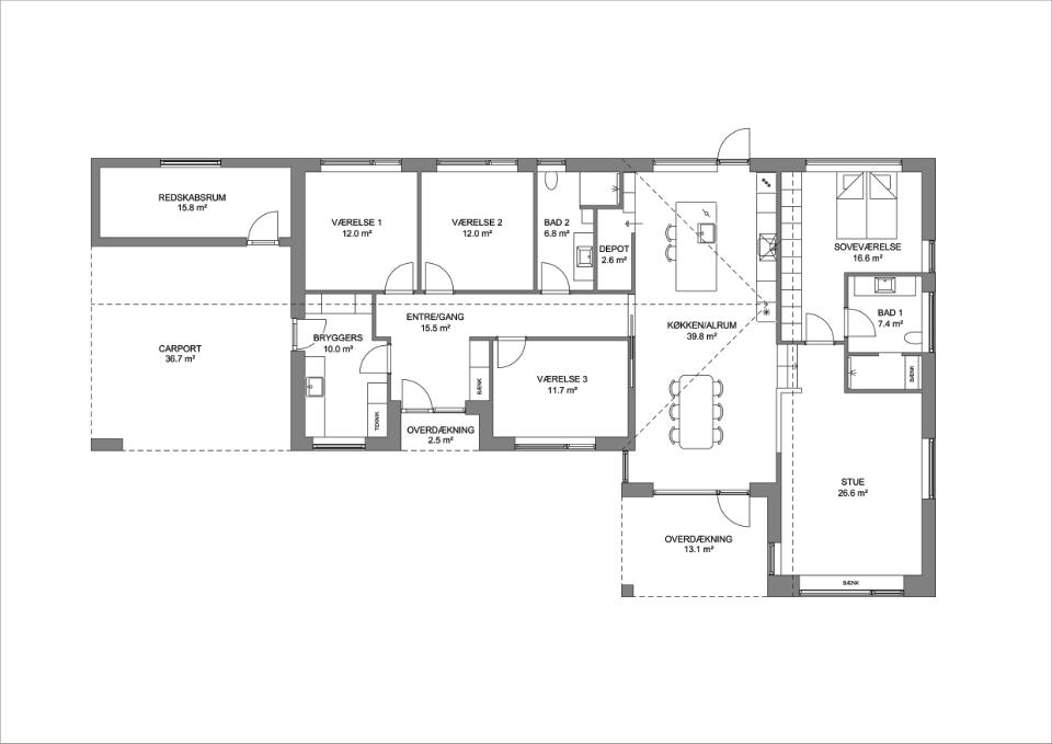 Til dagligt vil man komme til huset via den dobbelte carport og herfra ind i bryggers og videre til entréen. I denne afdeling af huset er der børneafdeling med tre gode værelser og badeværelse.